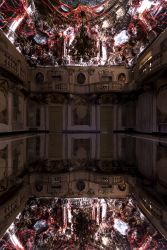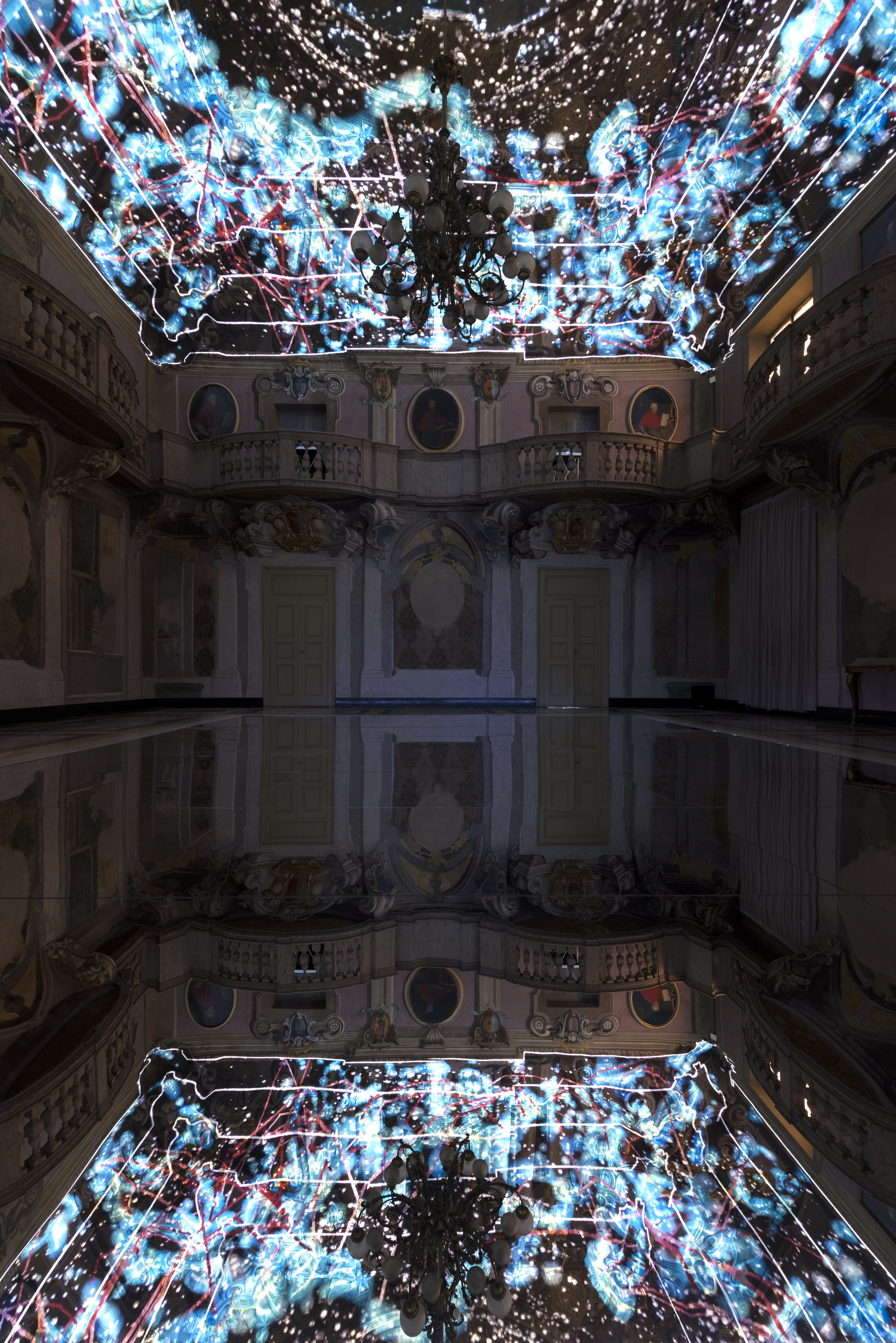 Si chiama A.N.N.A. : è il palindromo e nonché l’acronimo [Artificial Network Neural V.1.0]  che da vita a questa installazione all’interno della barocca Sala dei Cardinali, un’esperienza che ti immerge sia fisicamente che sensorialmente in uno spazio dove si  “respira una dimensione materna”, un grembo fatto di luce e suoni. Tecnicamente è un mapping procedurale che sviluppa una sequenza di animazioni a partire da un’elaborazione dell’affresco da cui discendono frequenze sonore che si legano in chiave sintetica al movimento, al colore e alla dimensione dei contenuti grafici generati. Gli affreschi interagiscono con la luce emanata dall’algoritmo che li rende inusuali, lo specchio posto sul pavimento della sala raddoppia ed esalta quello che avviene sulla volta.